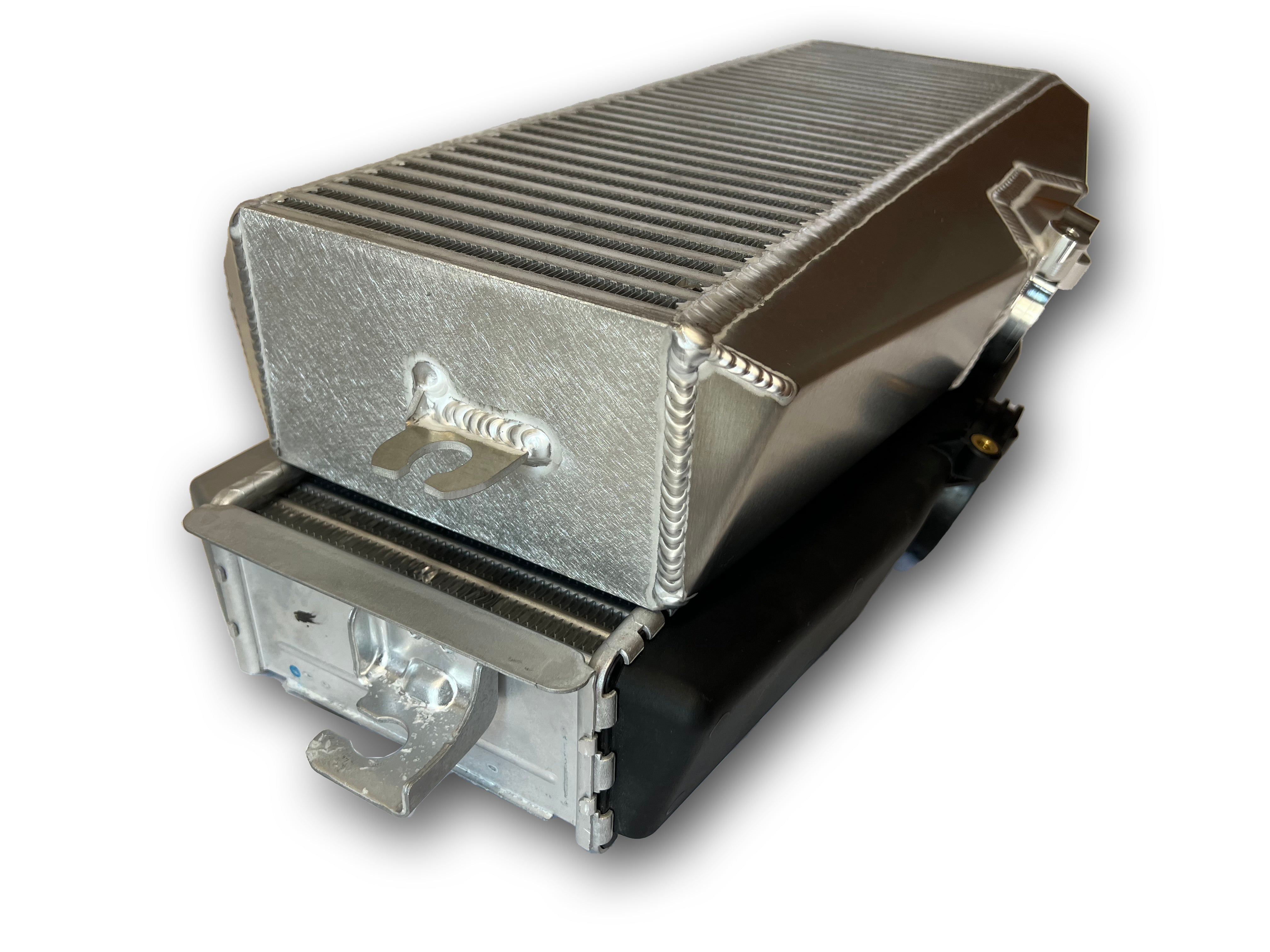 Featuring a massive 21" x 7" x 4" intercooler core, this ETS masterpiece is the largest top mount intercooler available on the market. With an impressive 34 charge rows compared to our competitors' 24 rows, this top mount intercooler maximizes heat transfer area, ensuring optimal cooling and increased performance.